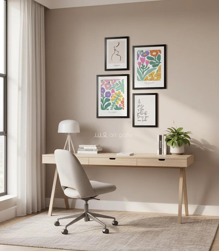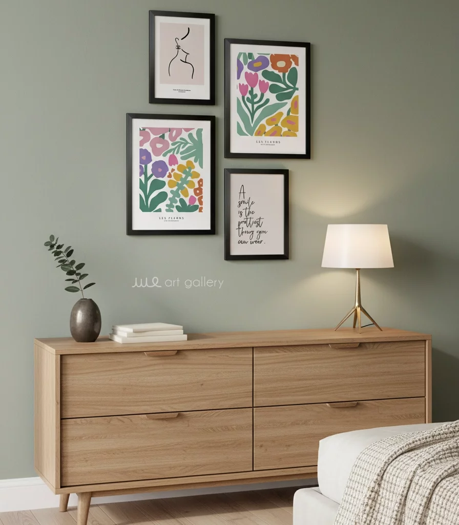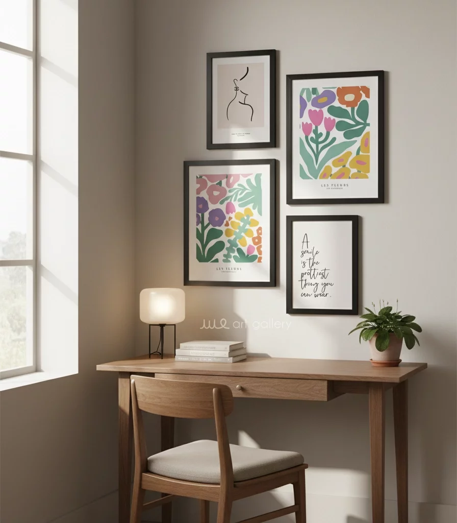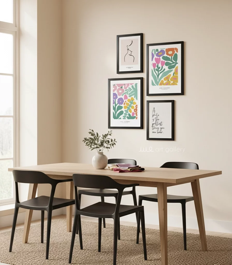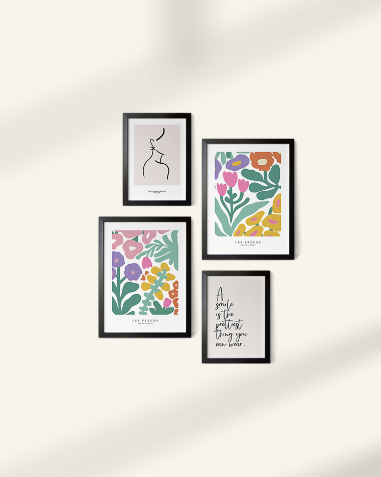 قابهای مقاوم و شیک (PVC): هر تابلو دارای قابی از جنس PVC با رنگ مشکی مات است. این قابها با طراحی ساده و مدرن خود، کنتراست زیبایی با رنگهای شاد طرحها ایجاد میکنند.