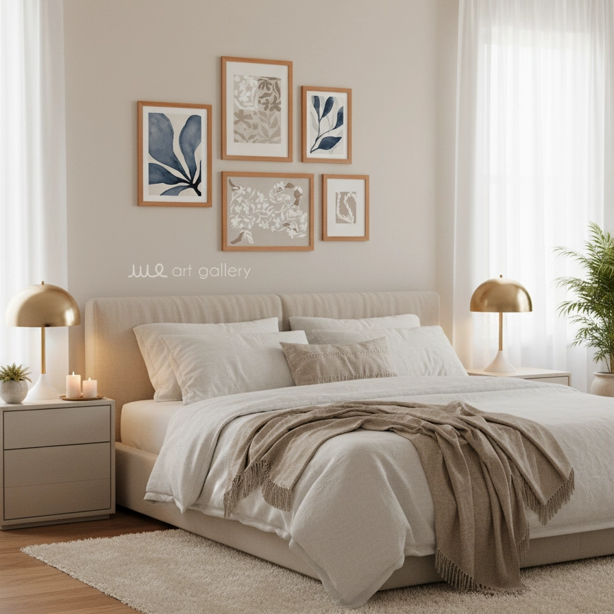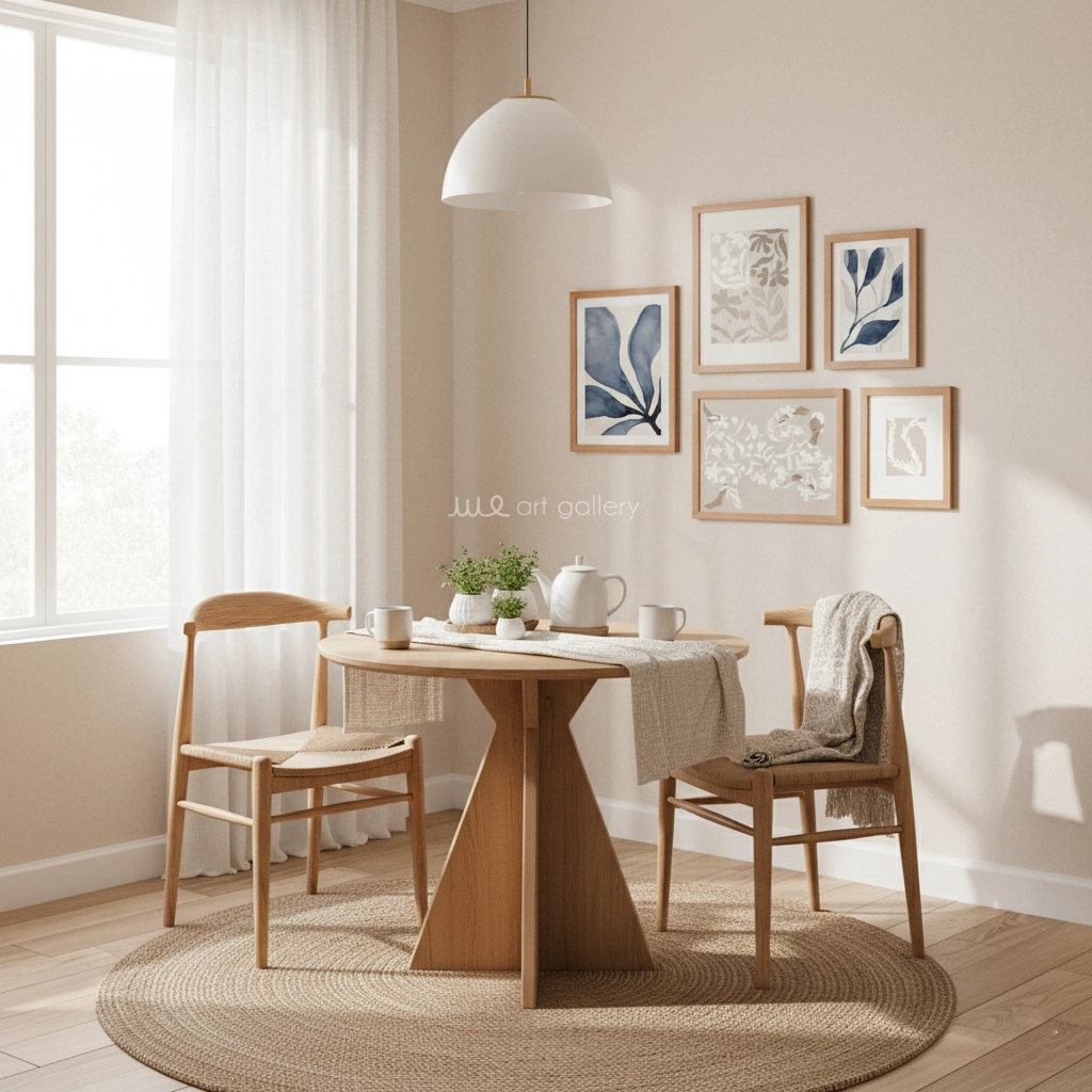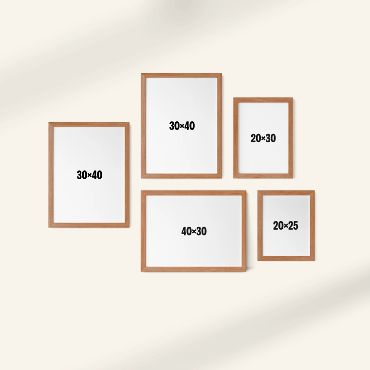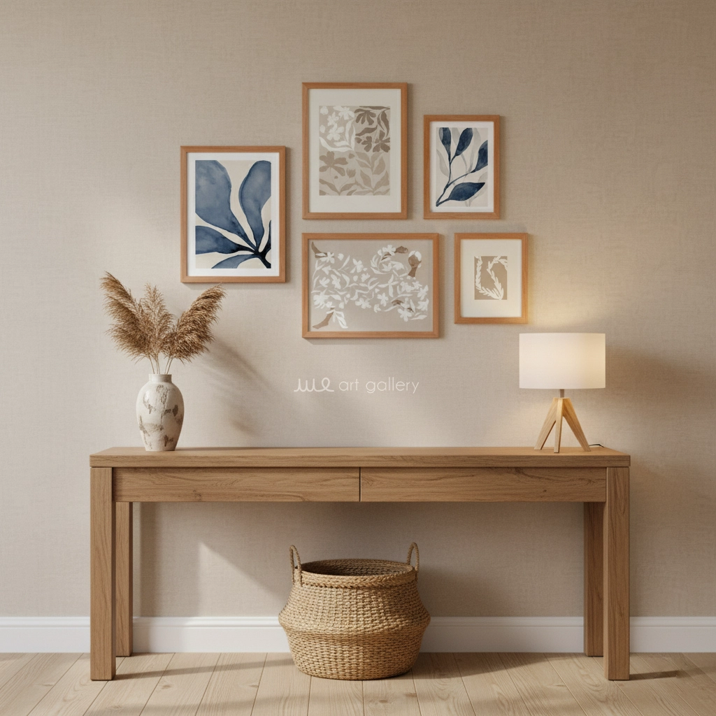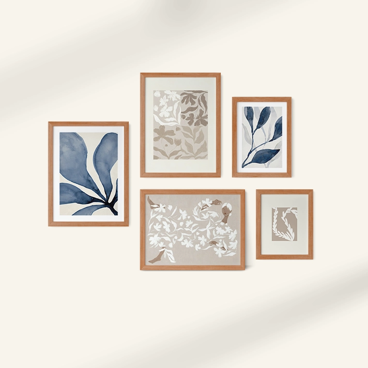 قابهای مقاوم و شیک (PVC با طرح چوب): هر تابلو دارای قابی از جنس PVC با روکش طرح چوب طبیعی روشن است. این قابها با طراحی گرم و مدرن خود، هارمونی بینظیری با پالت رنگی آبی و بژ طرحها ایجاد میکنند و حس طبیعت و لطافت را به فضا میآورند.