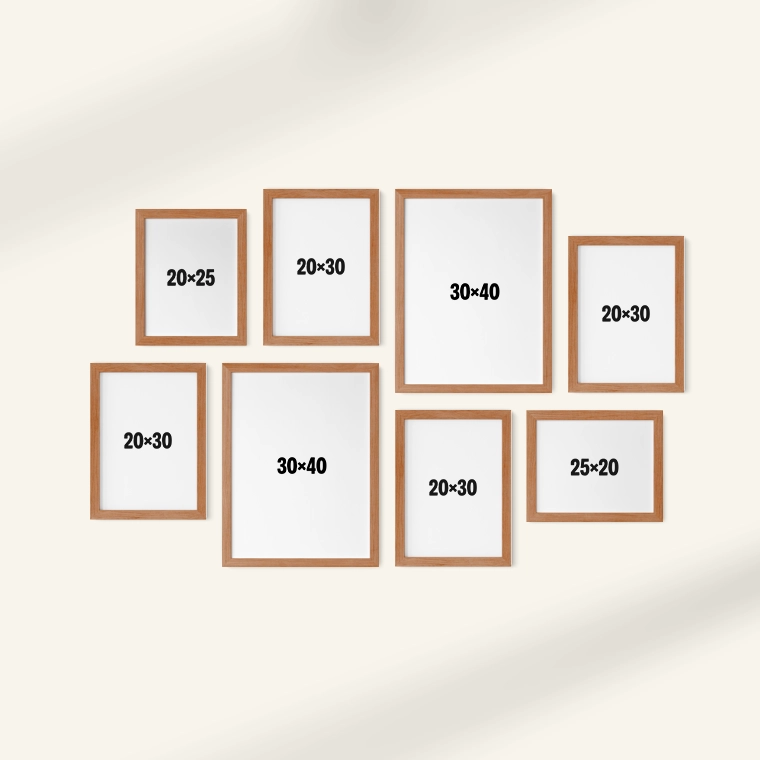 - ابعاد متنوع برای چیدمان هنرمندانه: ست شامل سایزهای مختلف است که به شما امکان میدهد یک چیدمان گالری دیواری حرفهای و پویا را به سادگی ایجاد کنید:
