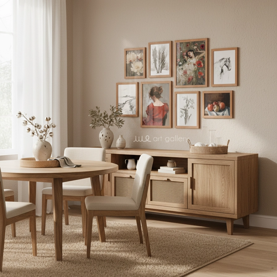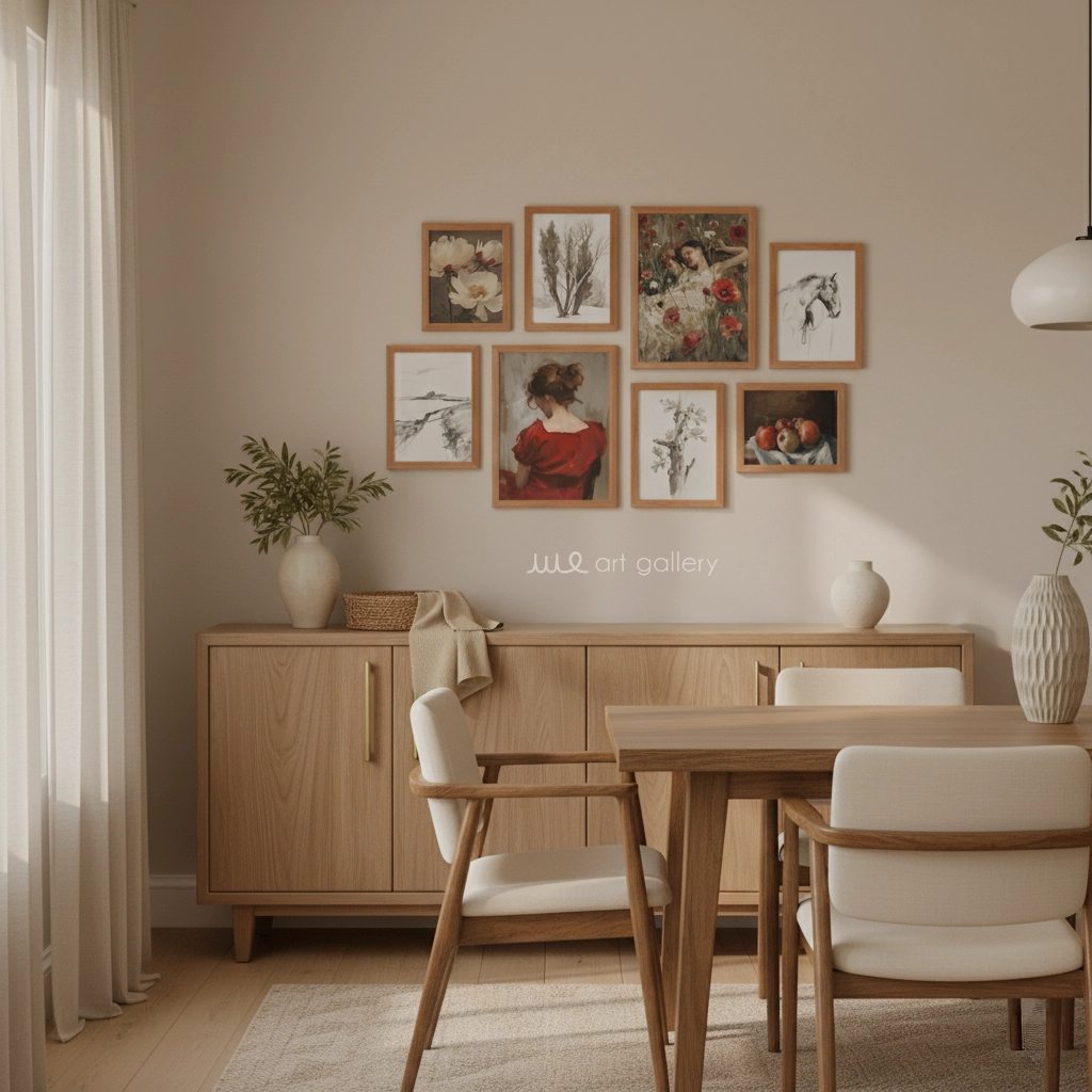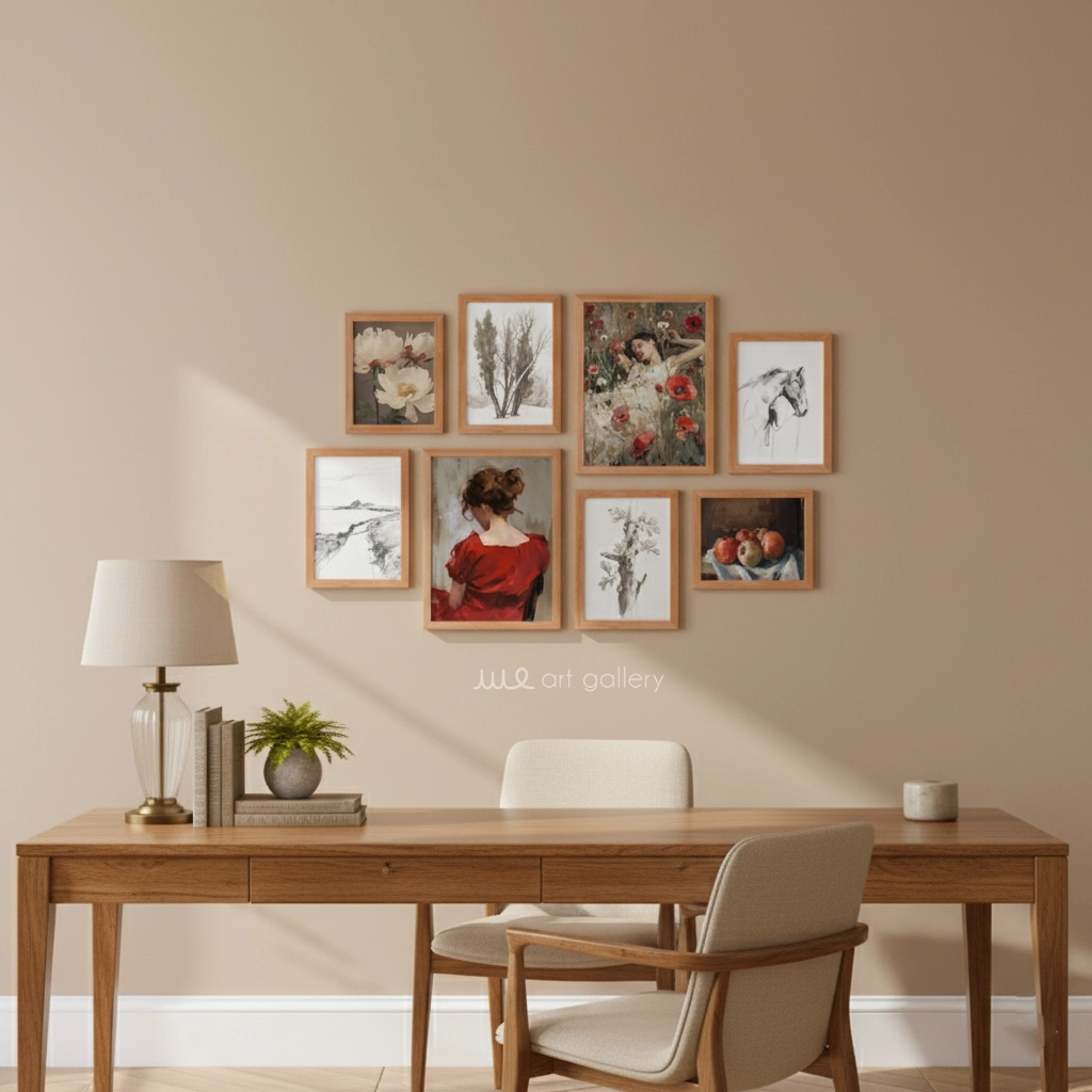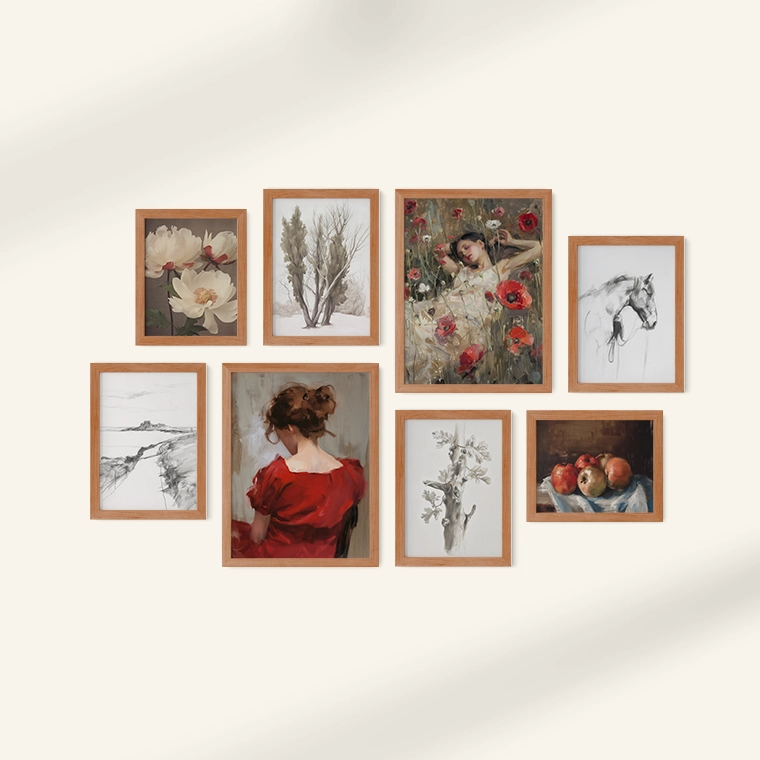 این یک مجموعه از هشت قاب عکس با سبکهای هنری متنوع است. تابلوها شامل نقاشیهای گل، منظره، پرتره زن، اسب و طبیعت بیجان با میوهها هستند. قابها چوبی و در ابعاد مختلف چیده شدهاند که چیدمان هنری و جذابی را ایجاد کردهاند.