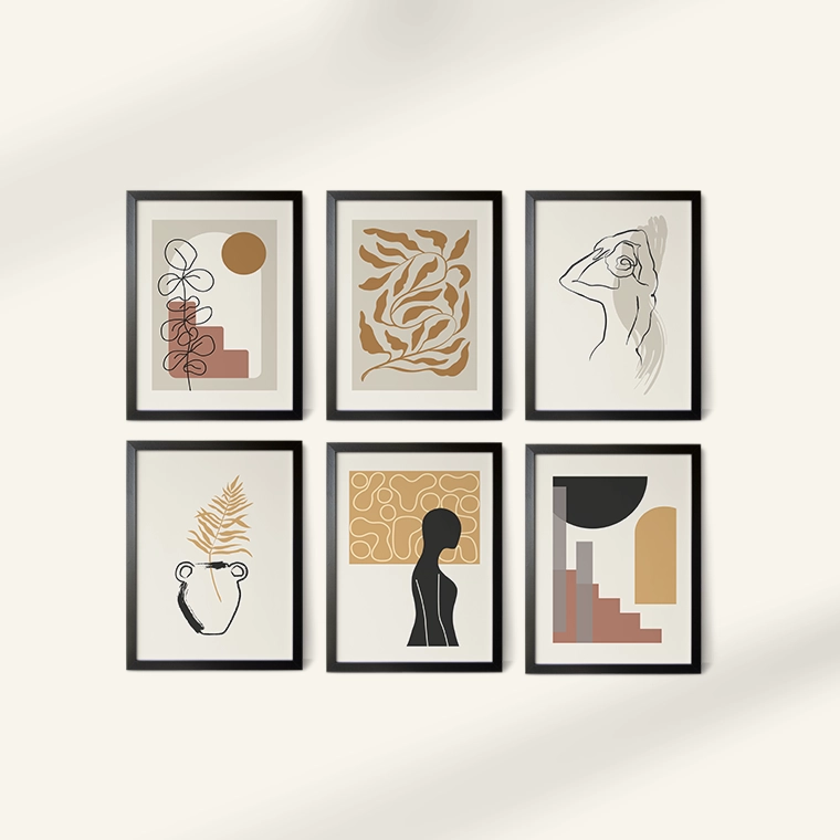 محتویات ست کامل: این پکیج شامل 6 عدد تابلو با طرحهای کاملاً هماهنگ و مکمل یکدیگر است که چیدمانی چشمنواز و هنری را بر روی دیوار شما فراهم میآورد. تنوع طرحها شامل پرترههای خطی، نقوش گیاهی، اشکال هندسی و الگوهای انتزاعی است.