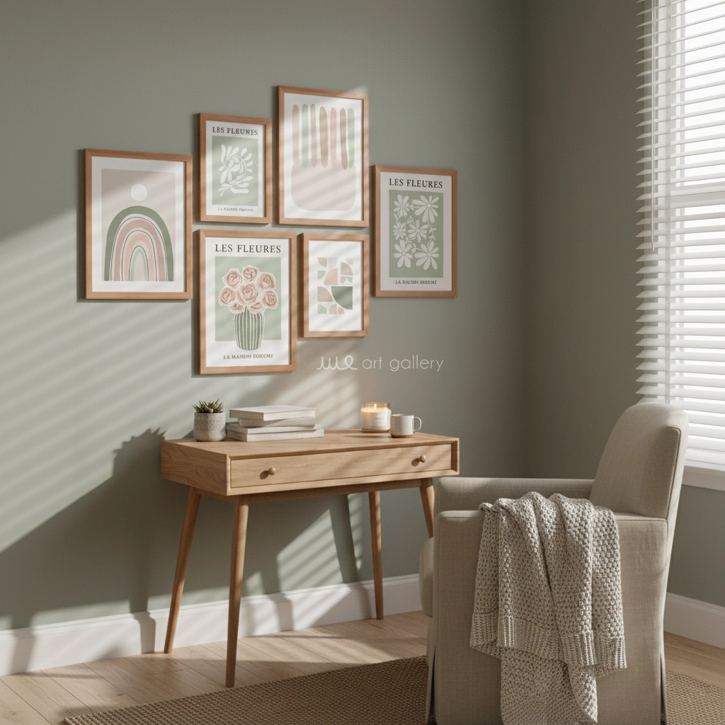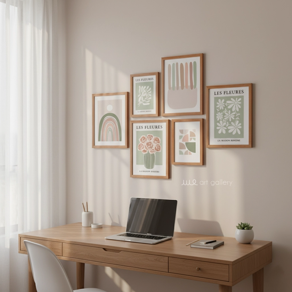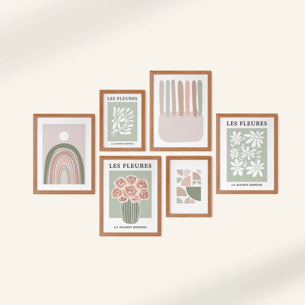 قابهای مقاوم و شیک (PVC): هر تابلو دارای قابی از جنس PVC با طرح چوب روشن است. این قابها با طراحی گرم و طبیعی خود، هارمونی بینظیری با پالت رنگی پاستلی و طرحهای طبیعتگرایانه تابلوها ایجاد میکنند و جلوهای دلنشین و بوهمی به مجموعه میبخشند.