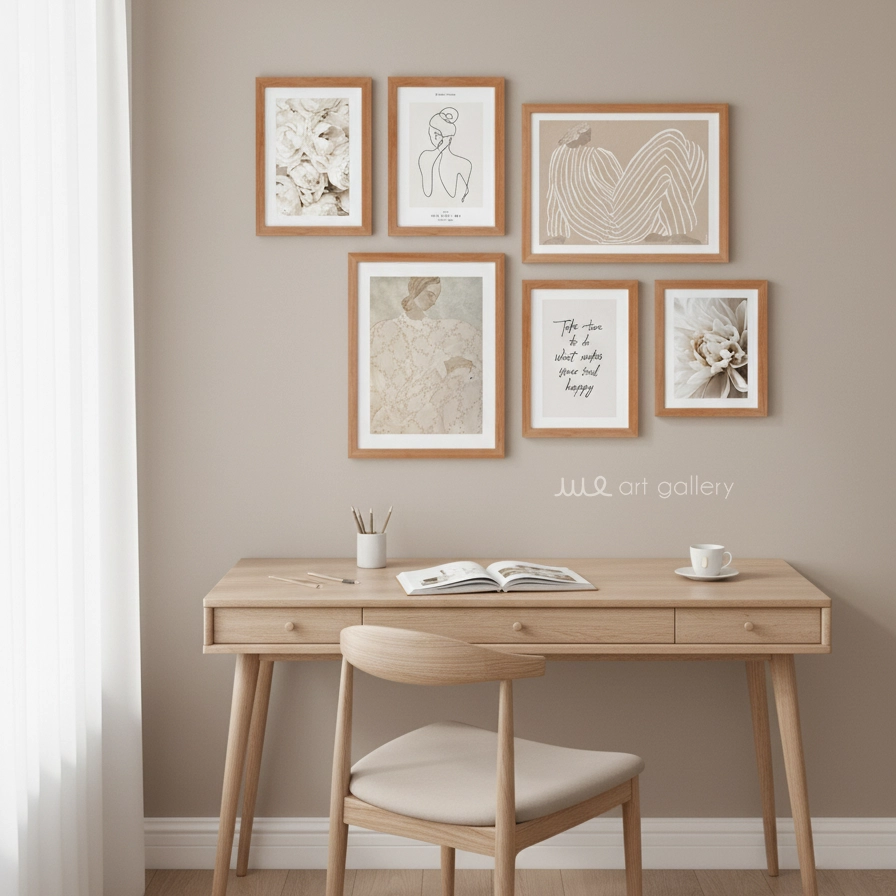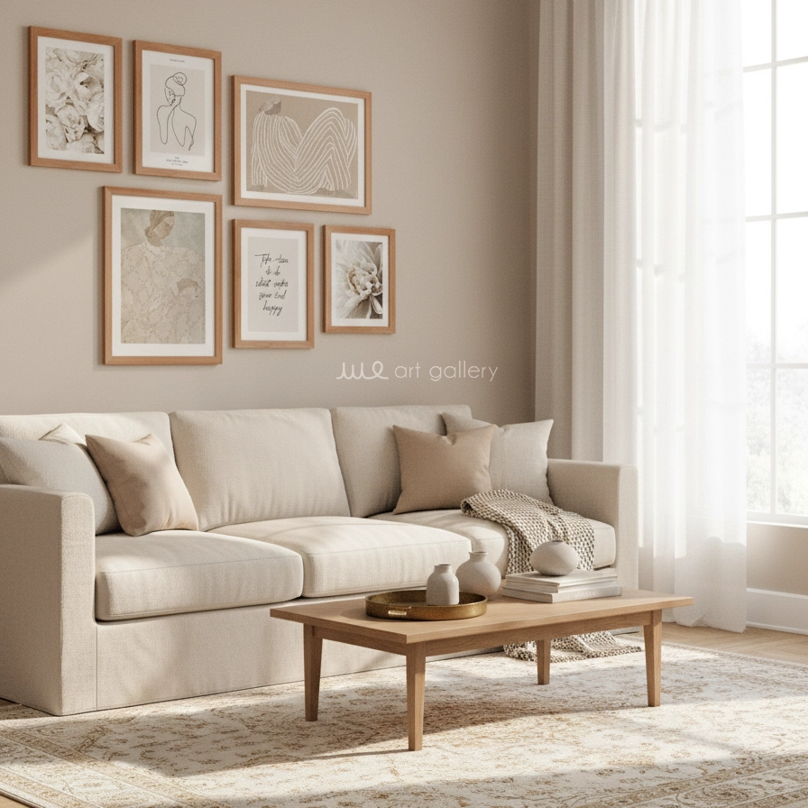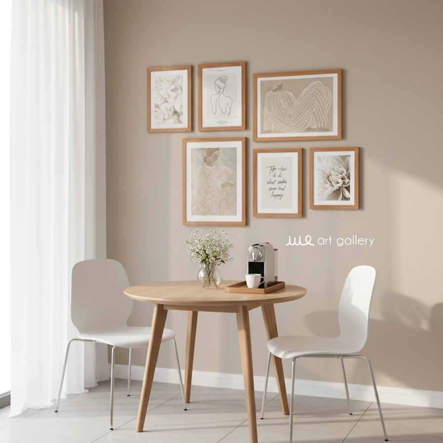 قابهای مقاوم و شیک (PVC): هر تابلو دارای قابی از جنس PVC با طرح چوب روشن است. این قابها با طراحی گرم و طبیعی خود، هارمونی بینظیری با پالت رنگی خنثی و آرام تابلوها ایجاد میکنند و جلوهای دلنشین و ارگانیک به مجموعه میبخشند.