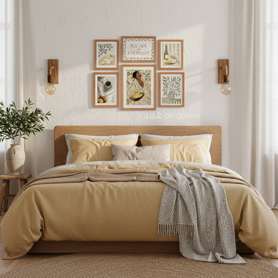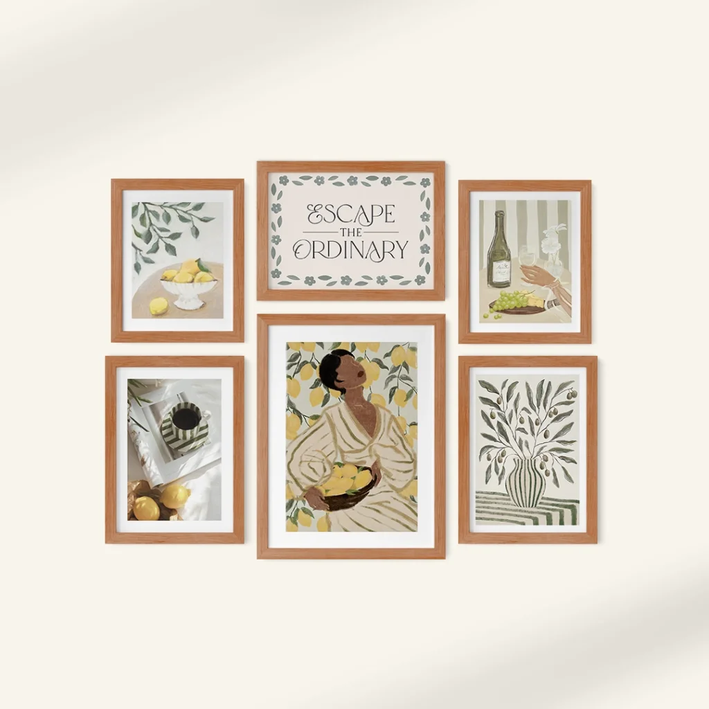 قابهای مقاوم و شیک (PVC): هر تابلو دارای قابی از جنس PVC با طرح چوب روشن است. این قابها با طراحی گرم و طبیعی خود، هارمونی بینظیری با پالت رنگی شاداب و مدیترانهای تابلوها ایجاد میکنند و جلوهای دلنشین و ارگانیک به مجموعه میبخشند.
