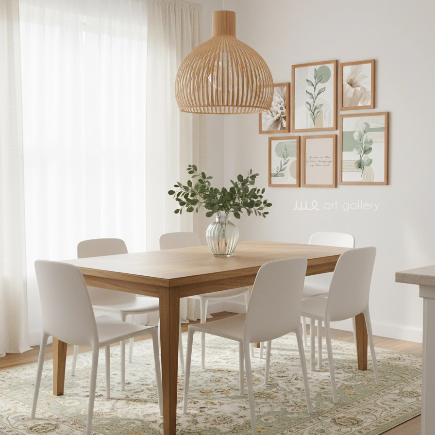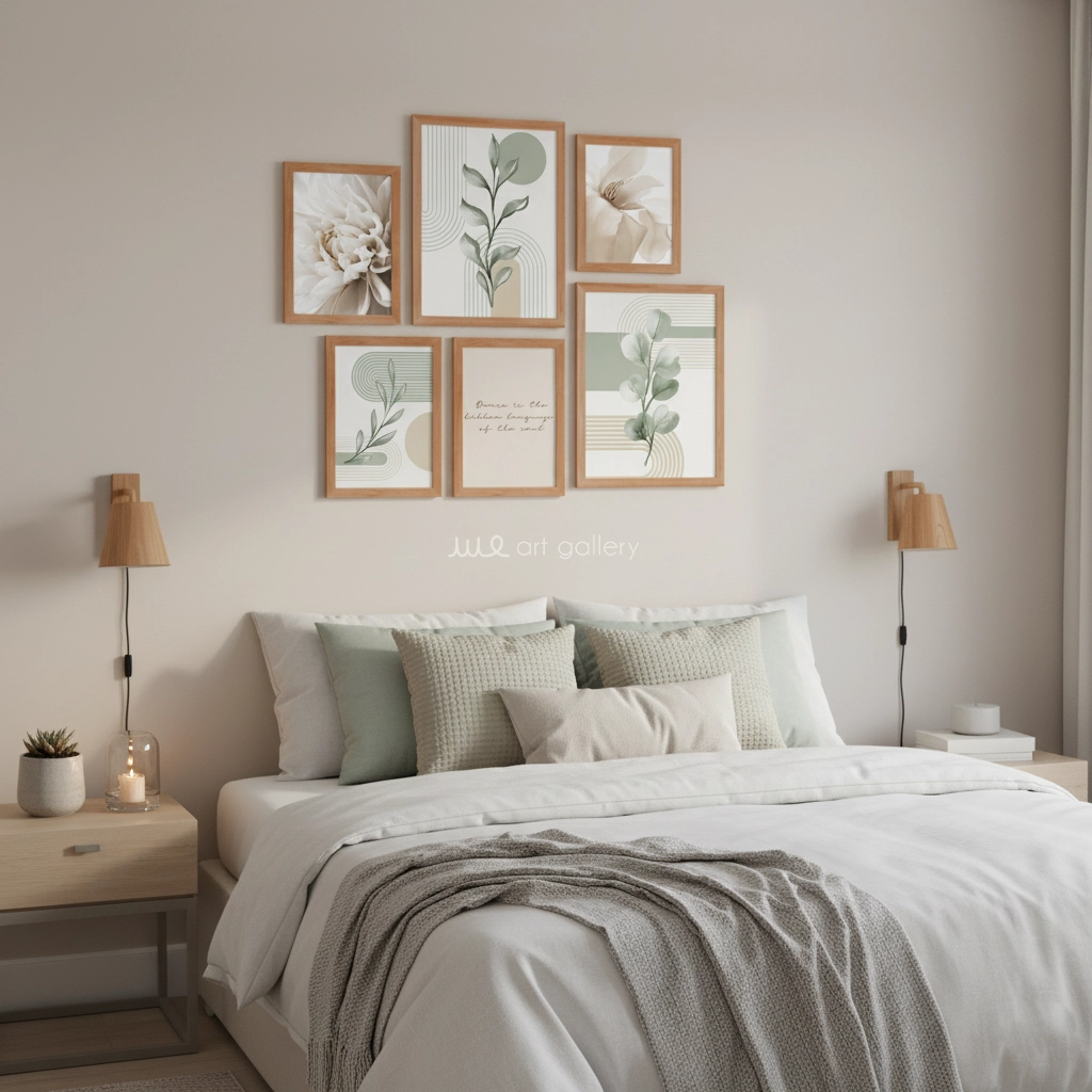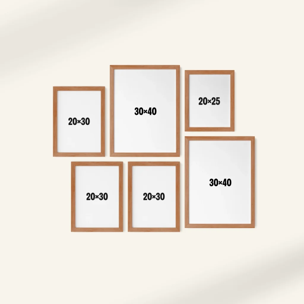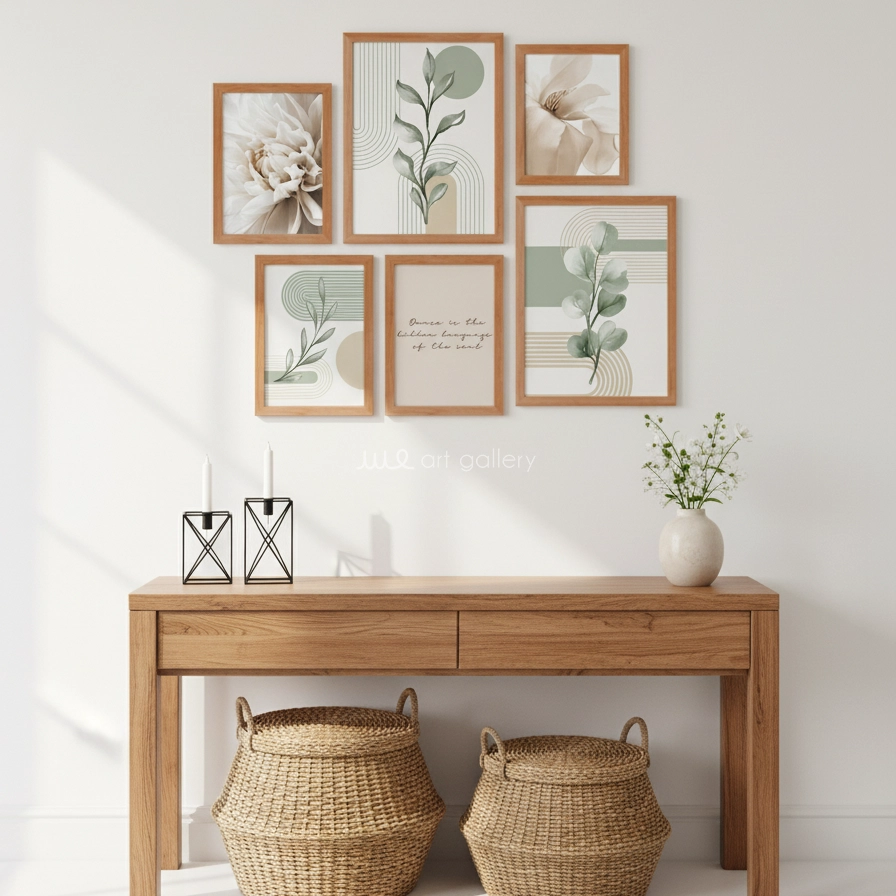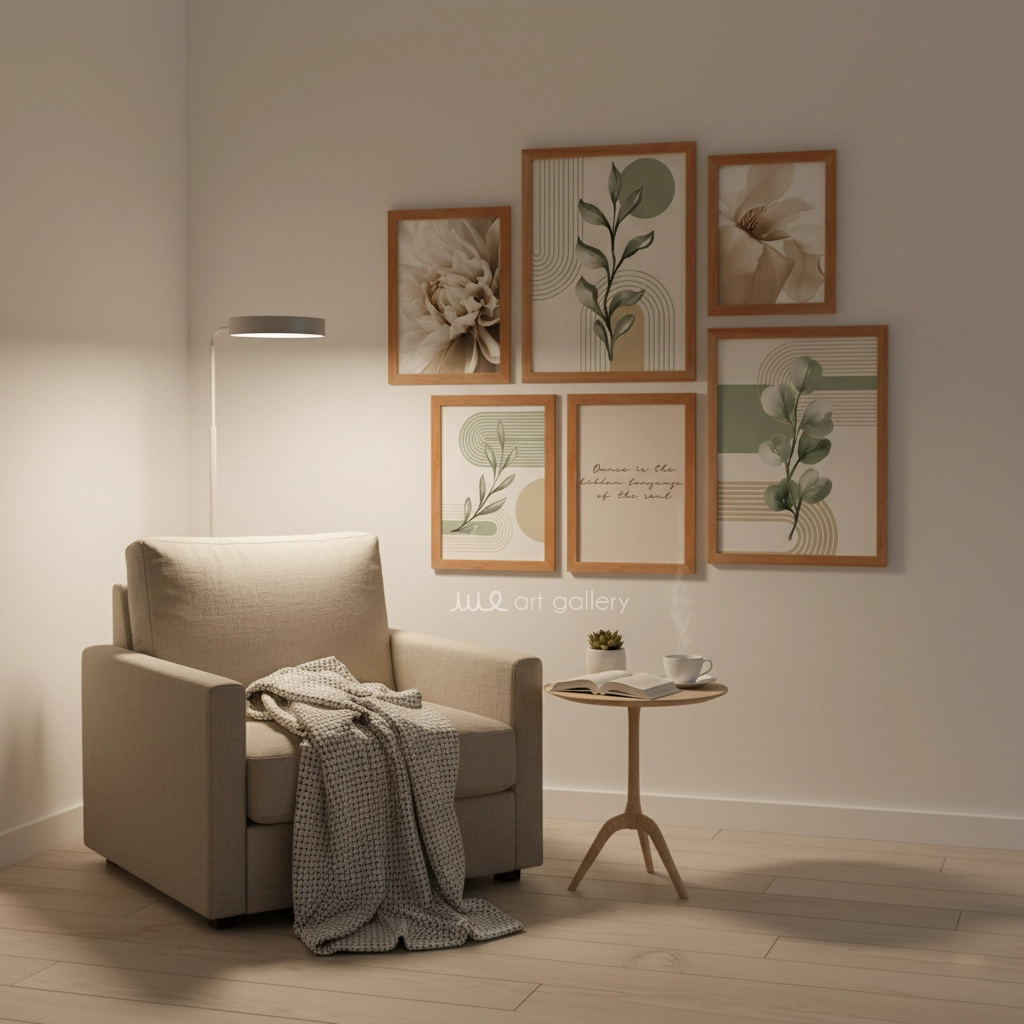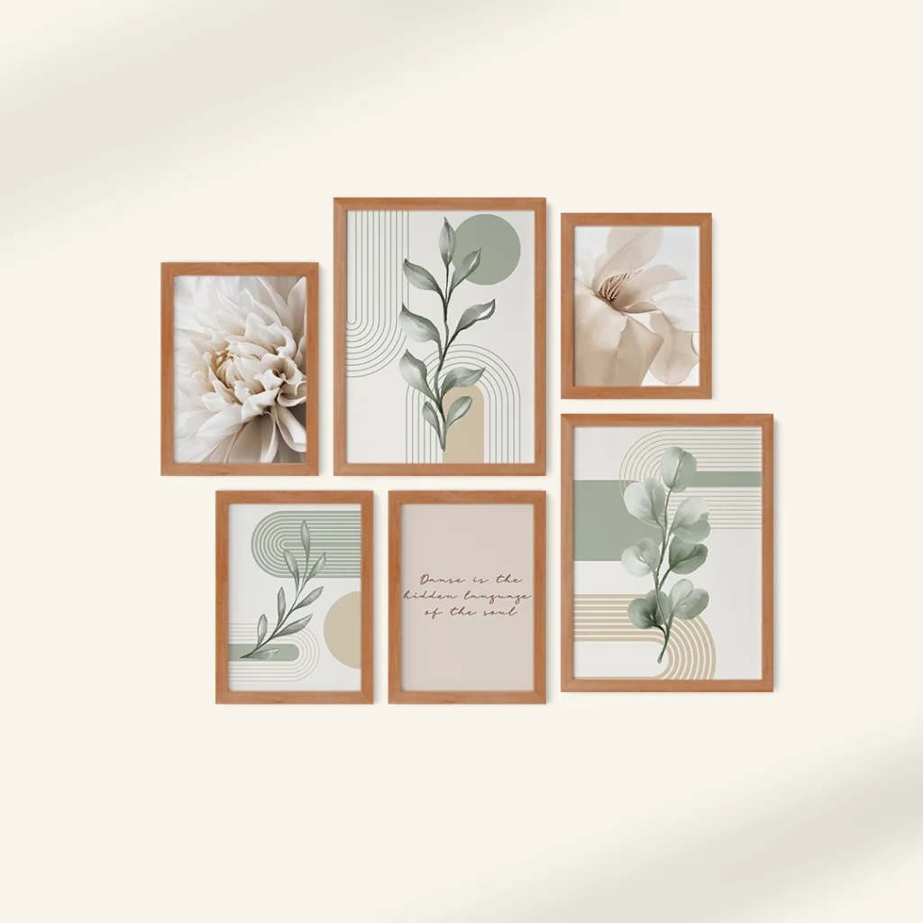 قابهای مقاوم و شیک (PVC): هر تابلو دارای قابی از جنس PVC با طرح چوب روشن است. این قابها با طراحی گرم و طبیعی خود، هارمونی بینظیری با پالت رنگی خنثی و آرام تابلوها ایجاد میکنند و جلوهای دلنشین و ارگانیک به مجموعه میبخشند.