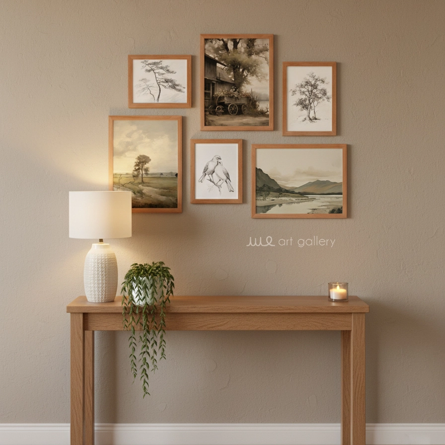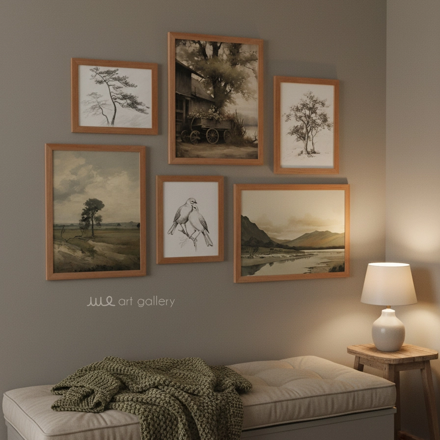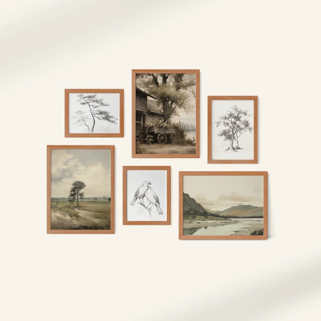 قابهای مقاوم و شیک (PVC): هر تابلو دارای قابی از جنس PVC با طرح چوب روشن است. این قابها با طراحی گرم و طبیعی خود، هارمونی بینظیری با پالت رنگی وینتیج و آرام تابلوها ایجاد میکنند و جلوهای دلنشین و ارگانیک به مجموعه میبخشند.