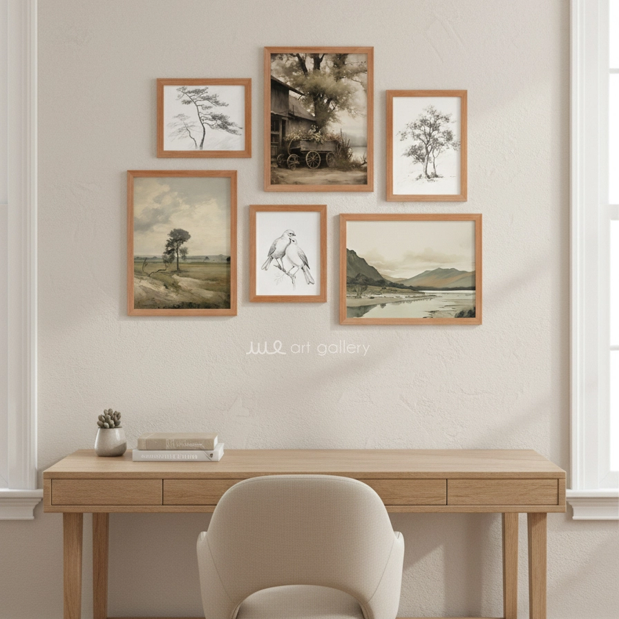با ست 6 تایی تابلو دکوراتیو "Serene Village"، دیوارهای خود را به بوم نقاشی از مناظر دلنشین روستایی، آرامش طبیعت و هنر وینتیج تبدیل کنید. این مجموعه منحصربهفرد، با تلفیقی هنرمندانه از نقاشیهای کلاسیک (کلبه روستایی، مناظر دشت و رودخانه)، طرحهای خطی ظریف از درختان تنها و پرندگان عاشق، فضایی نوستالژیک، دنج و سرشار از آرامش را در منزل یا محل کار شما خلق میکند. "Serene Village" نه تنها یک دکور زیبا، بلکه یادآور سادگی زندگی، زیبایی طبیعت و لحظات دلنشین گذشته است.