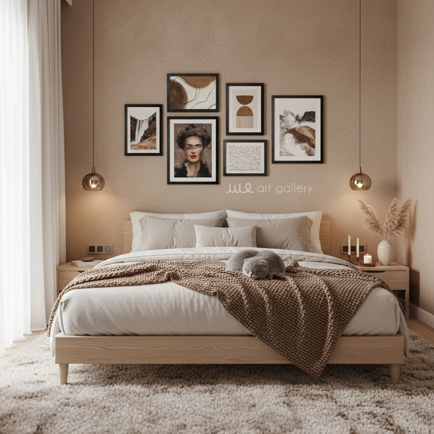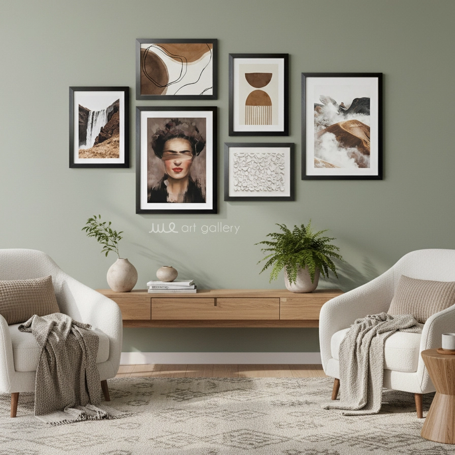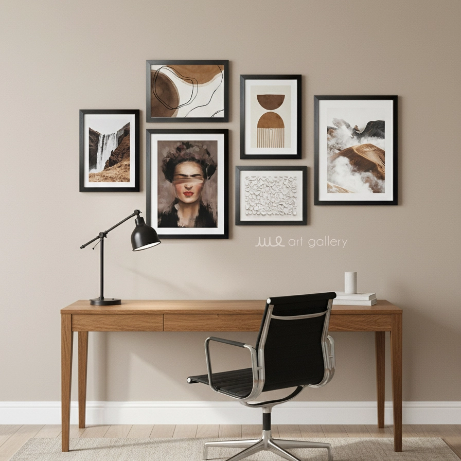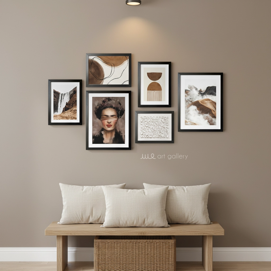 پالت رنگی گرم و طبیعی: رنگهای غالب در این مجموعه شامل قهوهای (طیفهای مختلف، خاکی)، بژ، کرم، مشکی، سفید و کمی رنگ قرمز (در پرتره) است. این پالت رنگی گرم و طبیعی، حسی از عمق، اصالت، مدرنیته و ارتباط با طبیعت را به فضا میبخشد و به راحتی با دکوراسیونهای مدرن، بوهمی، مینیمال و فضاهایی با تم خاص و هنری هماهنگ میشود.