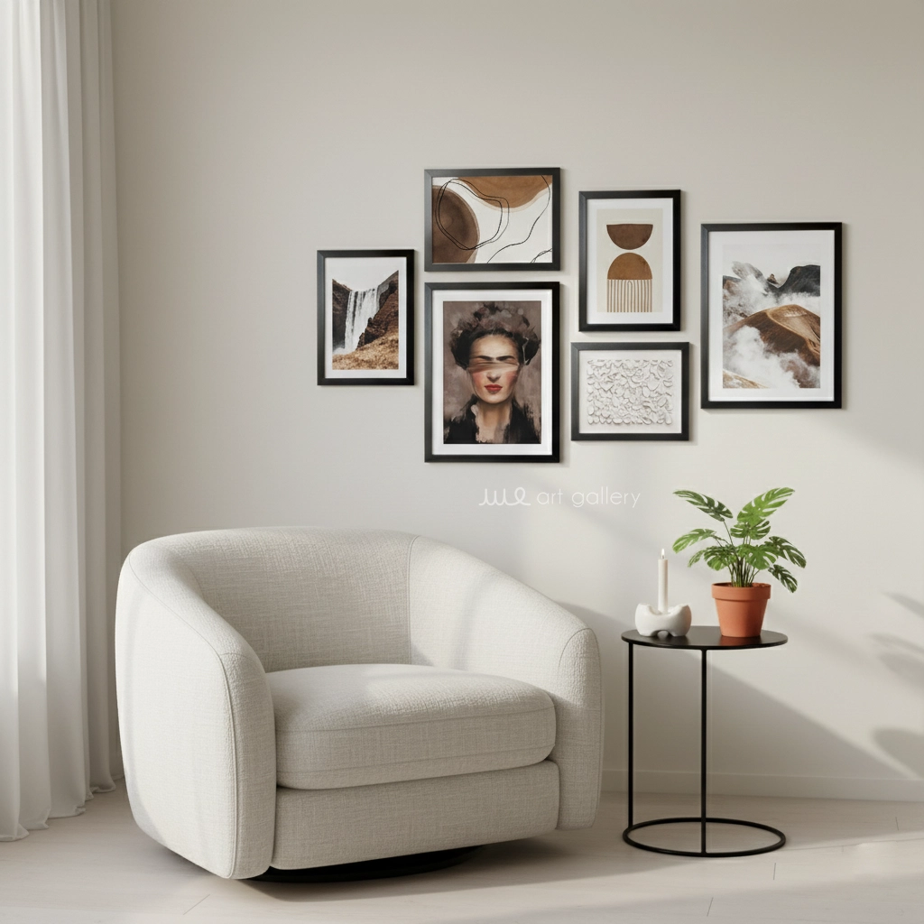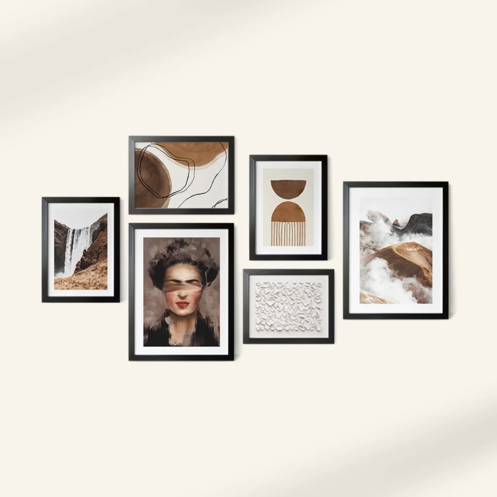 قابهای مقاوم و شیک (PVC): هر تابلو دارای قابی از جنس PVC به رنگ مشکی است. این قابها با طراحی تمیز و مدرن خود، کنتراست زیبایی با پالت رنگی گرم و خاکی تابلوها ایجاد میکنند و جلوهای شیک و معاصر به مجموعه میبخشند. د.