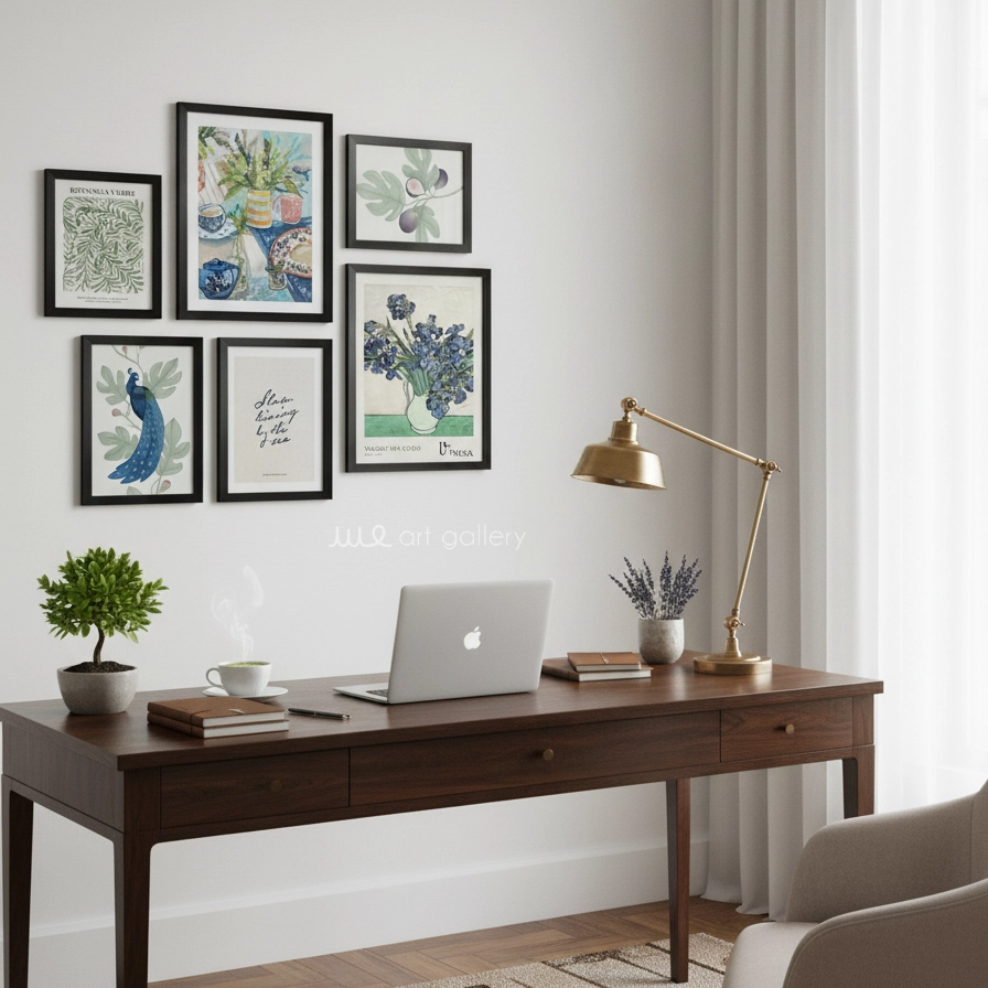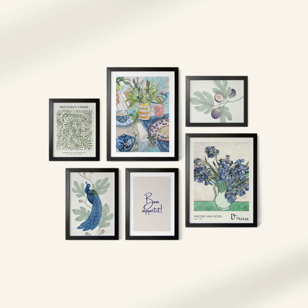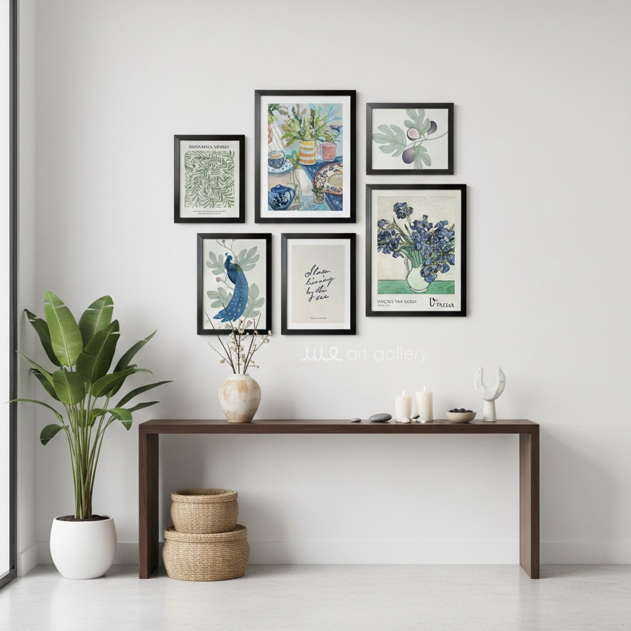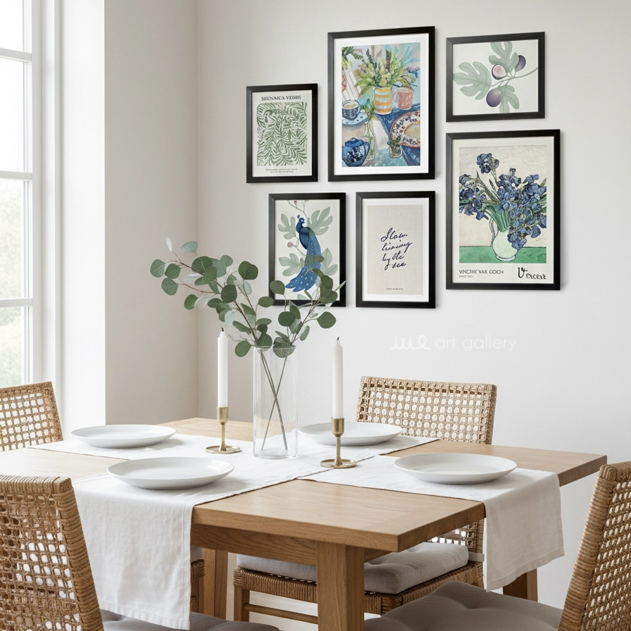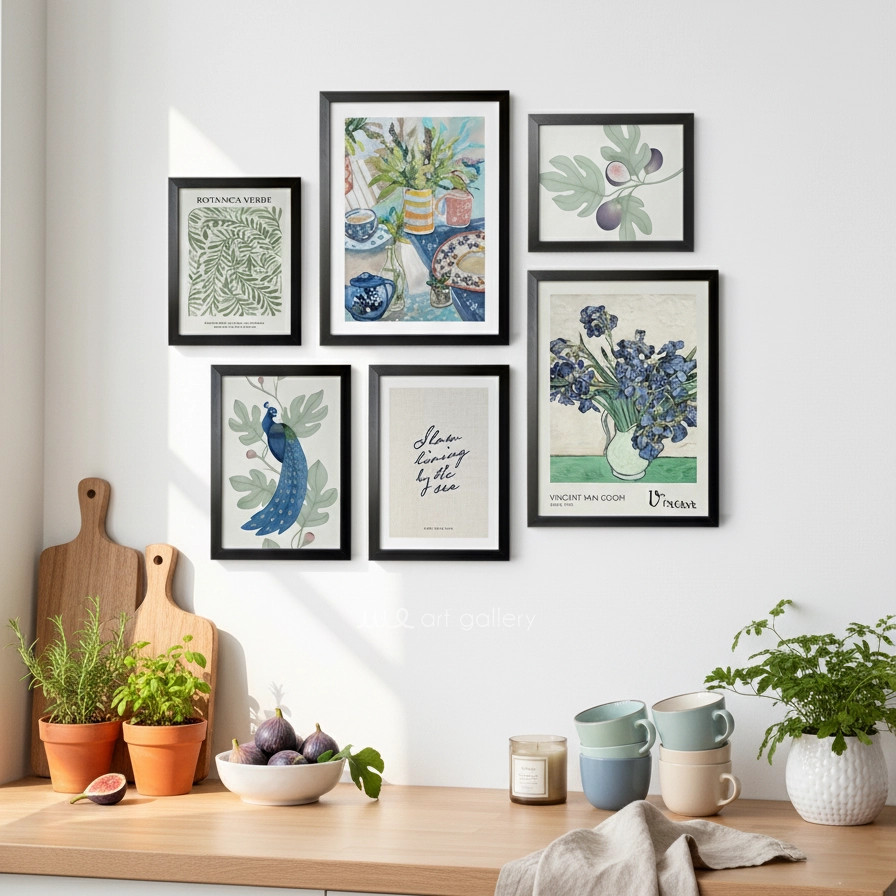 نقاشی سفره با گل و میوه: نقاشی رنگارنگ و شاداب از یک سفره با گلدانی از گلهای بنفش، میوهها و ظروف، حسی از زندگی و فراوانی. نقاشی "زنبقها" اثر ونگوگ: یکی از مشهورترین آثار ونگوگ از زنبقهای آبی در گلدان، نمادی از زیبایی و آرامش طبیعت. طرح "BOTANICA VERDE": طرحی گرافیکی و زیبا از برگهای گیاهی در رنگ سبز و سفید، با عنوان "BOTANICA VERDE"، نمادی از طبیعت و شادابی. طرح برگ و انجیر: نقاشی ظریف از برگهای انجیر با میوههای بنفش رنگ آن، حسی از طبیعت و سلامت. نقاشی طاووس: تصویری باشکوه از یک طاووس آبی زیبا که بر روی شاخه نشسته، نمادی از زیبایی، شکوه و آرامش. تابلوی متنی انگیزشی: با عبارت "Slow living by the sea"، پیامی برای لذت بردن از زندگی آرام و ارتباط با طبیعت (دریا).