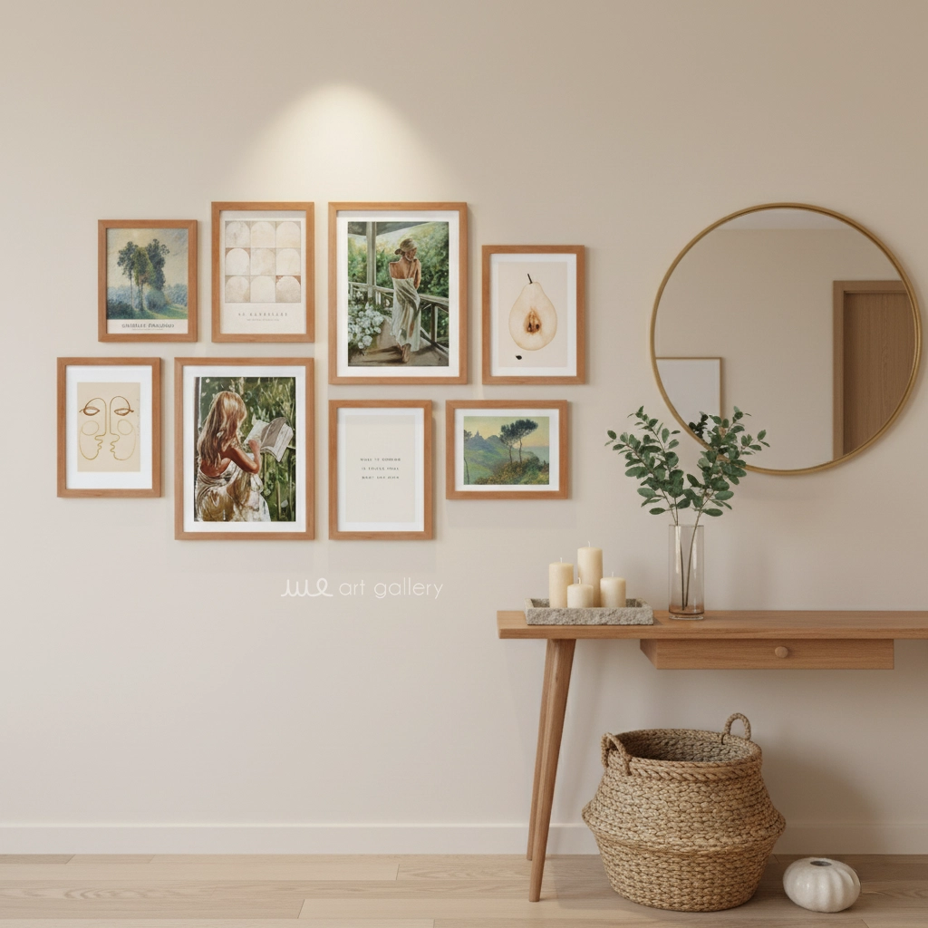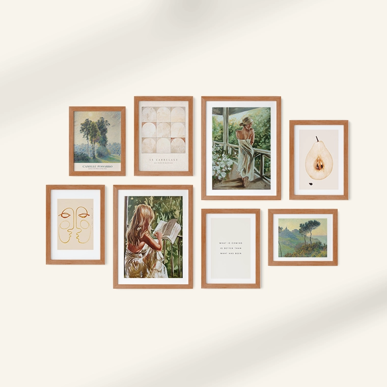 قابهای مقاوم و شیک (PVC): هر تابلو دارای قابی از جنس PVC به رنگ چوبی است. این قابها با طراحی تمیز و مدرن خود، کنتراست زیبایی با پالت رنگی متنوع تابلوها ایجاد میکنند و جلوهای شیک و معاصر به مجموعه میبخشند.