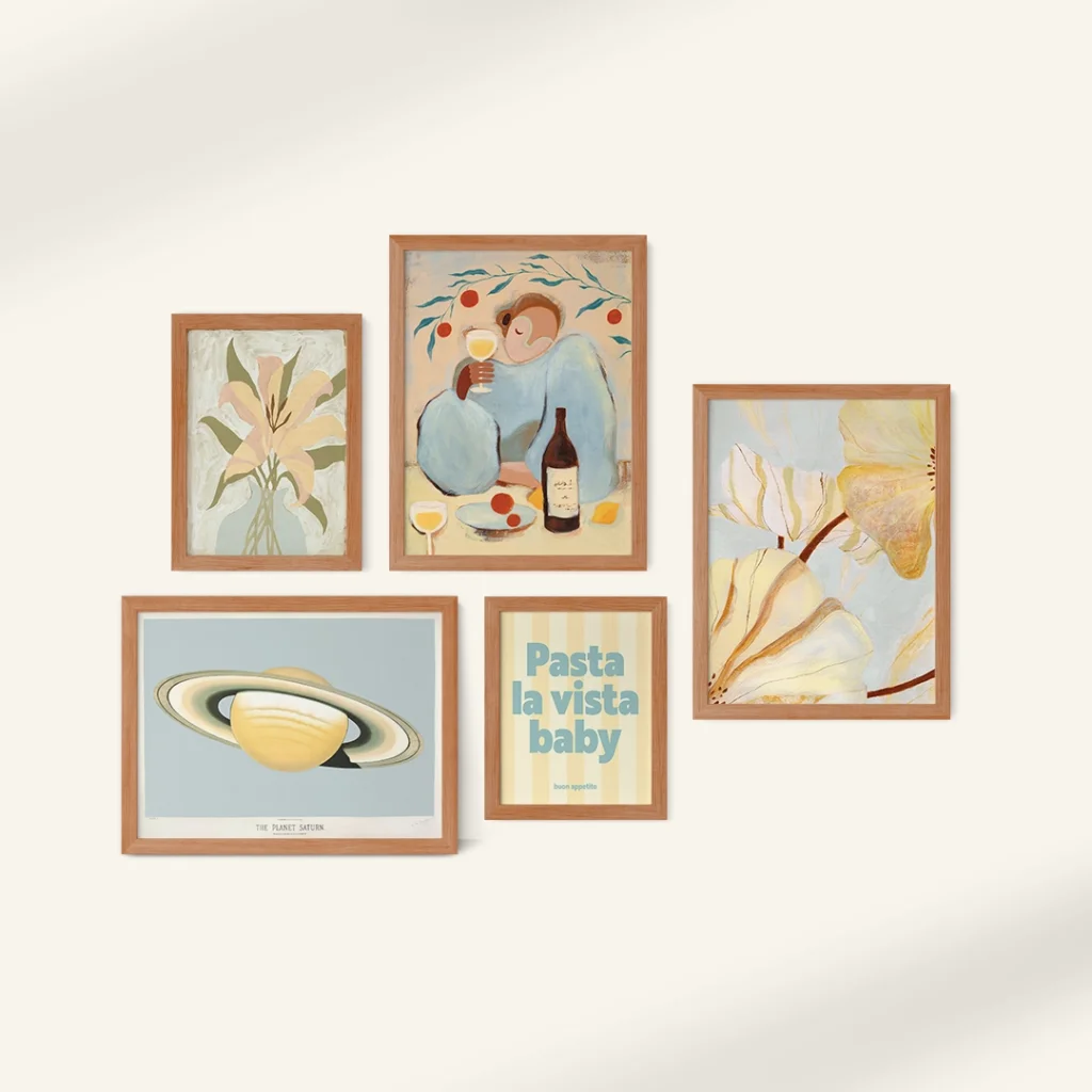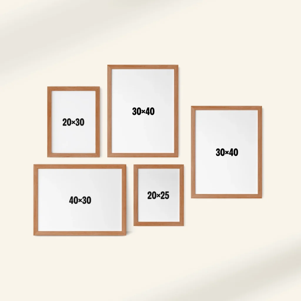 قابهای مقاوم و شیک (PVC): هر تابلو دارای قابی از جنس PVC با طرح چوب روشن است. این قابها با طراحی گرم و طبیعی خود، با پالت رنگی شاداب تابلوها هماهنگی ایجاد میکنند و جلوهای مدرن و دلنشین به مجموعه میبخشند.
