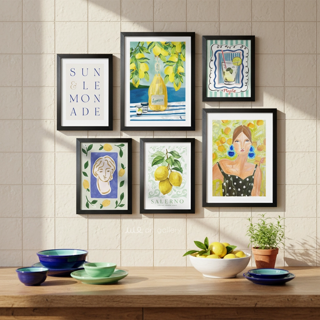 نقاشی فیگوراتیو با گوشوارههای آبی: پرترهای جسورانه و رنگارنگ از زنی با گوشوارههای آبی و پسزمینهای از لیمو، نمادی از مد و زیبایی. نقاشی بطری لیموناد: تصویری دلنشین از بطری لیموناد خانگی در زیر درخت لیمو، با پسزمینهای آبی و راه راه، حسی از طراوت تابستان. نقاشی لیوان موهیتو/لیموناد: طرحی جذاب از لیوان لیموناد یا موهیتو با برگ نعنا و نی، در پسزمینهای راه راه سبز و سفید، تداعیگر نوشیدنیهای خنک. طرح مجسمه یونانی با لیمو: نقاشی هنری از سر یک مجسمه کلاسیک با پسزمینهای بنفش و حاشیهای از لیمو، تلفیقی از هنر کلاسیک و مدرن. برگ لیمو و متن "SALERNO": طرحی ساده و زیبا از شاخه لیمو با میوههای رسیده، با متن "SALERNO AMALFI COAST"، یادآور سواحل مدیترانه. تابلوی متنی "SUN & LEMONADE": متنی ساده و شیک "SUN & LEMONADE" با فونتی مدرن، خلاصه کننده حال و هوای شاداب و تابستانی مجموعه.