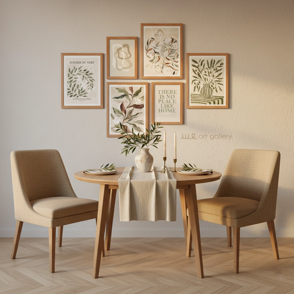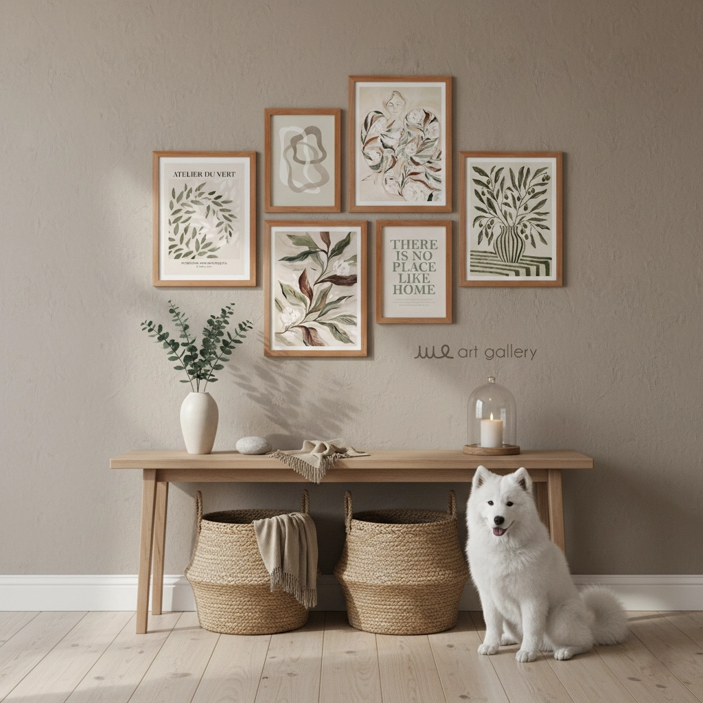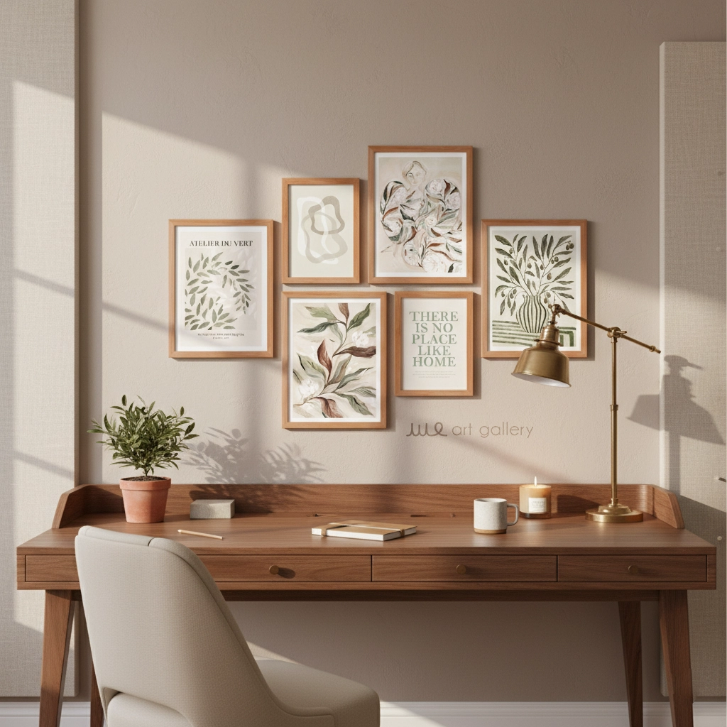 مجموعهای گرم و دلنشین از طرحهای گیاهی و انتزاعی با قابهای چوبی برای خلق فضایی آرام، طبیعی و الهامبخش.