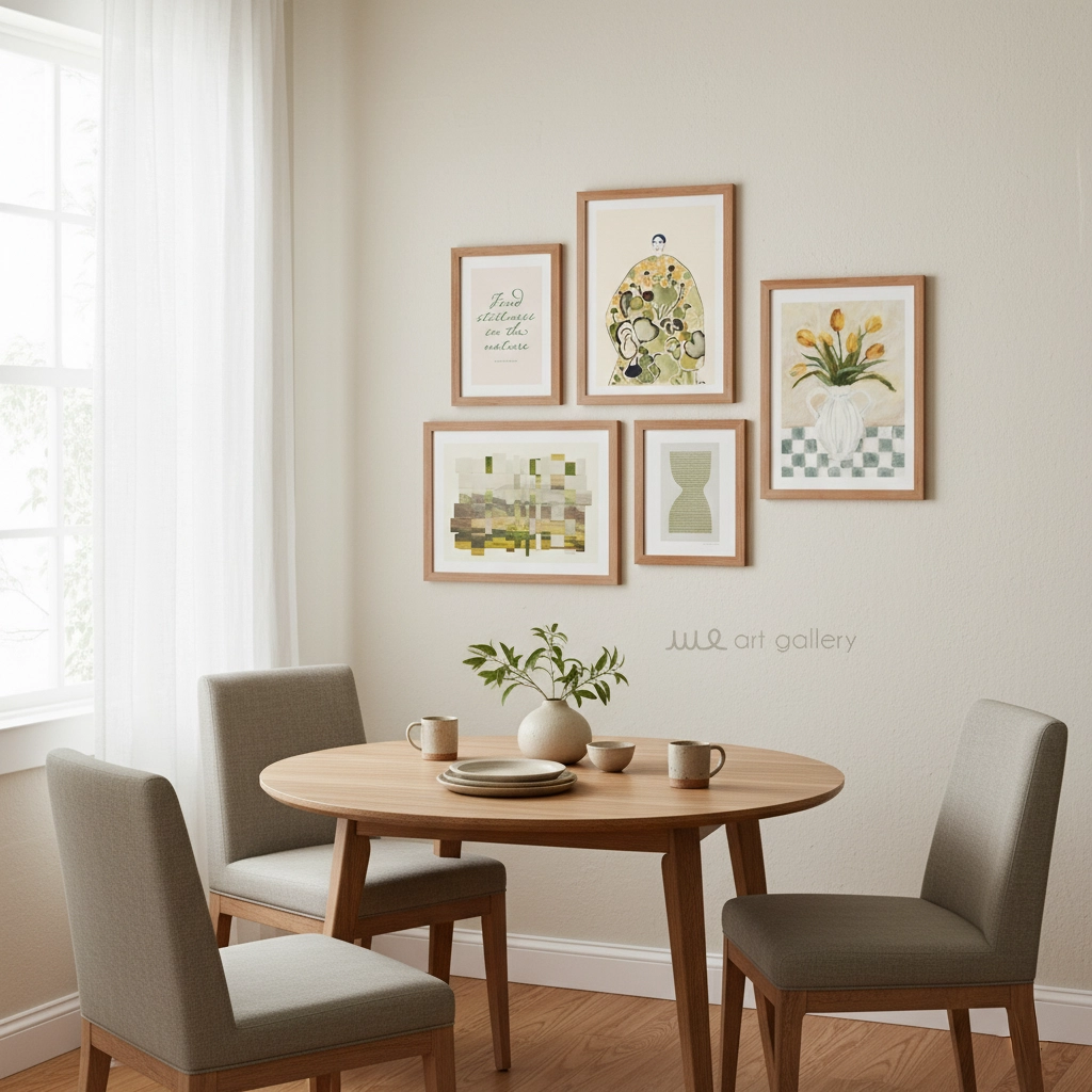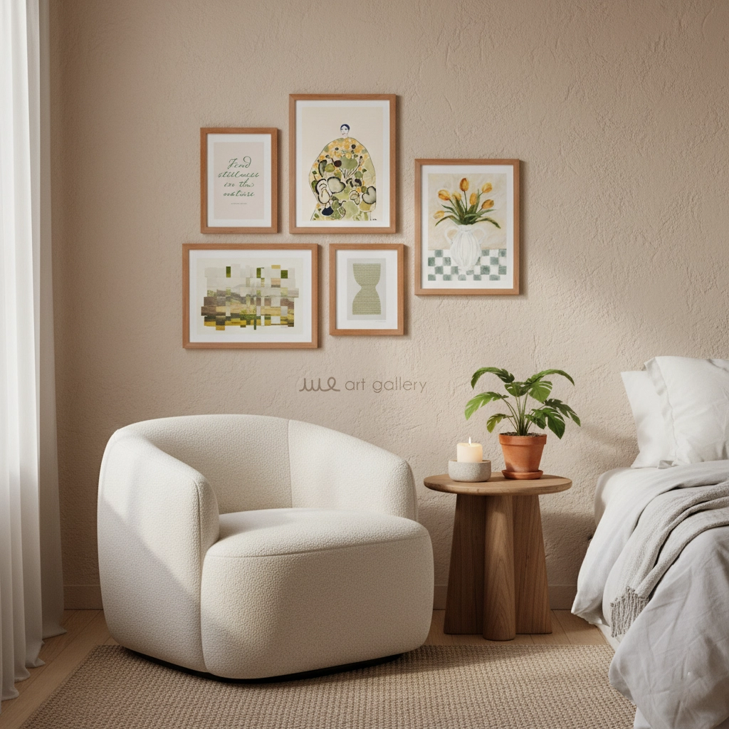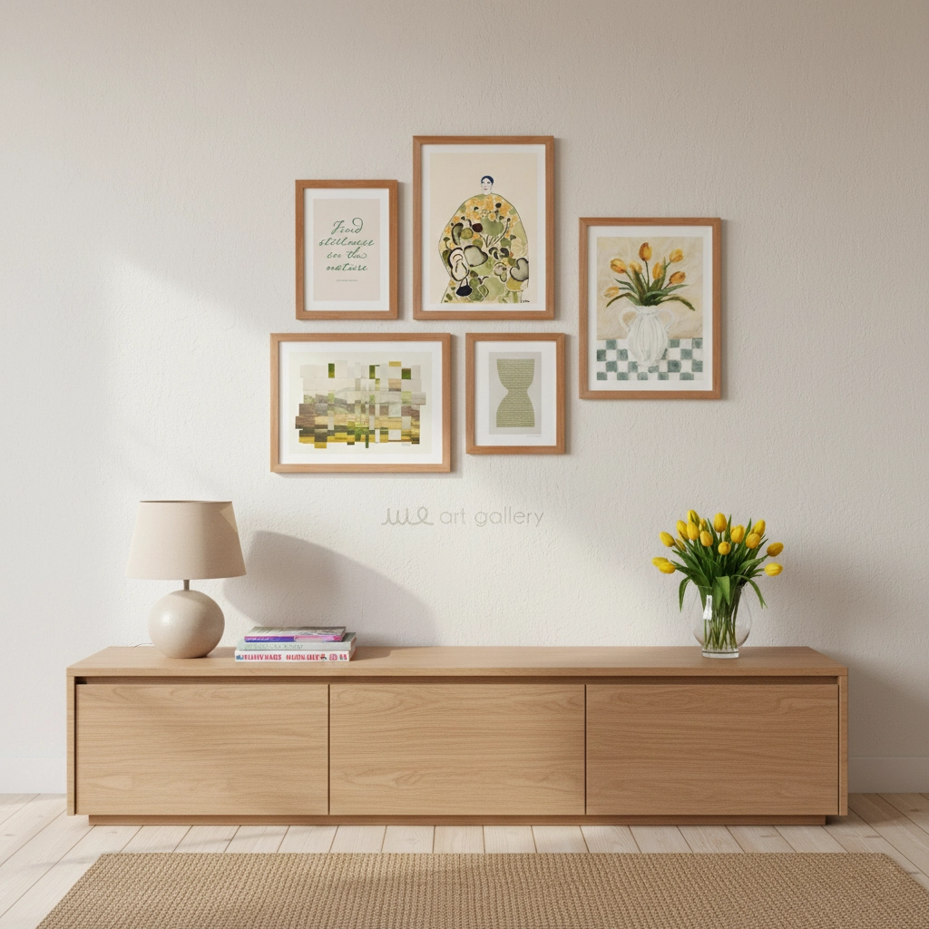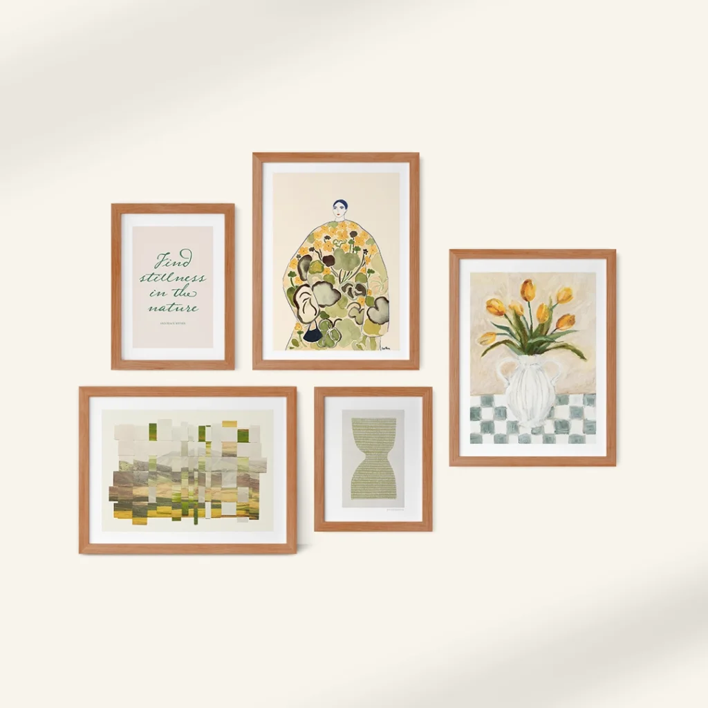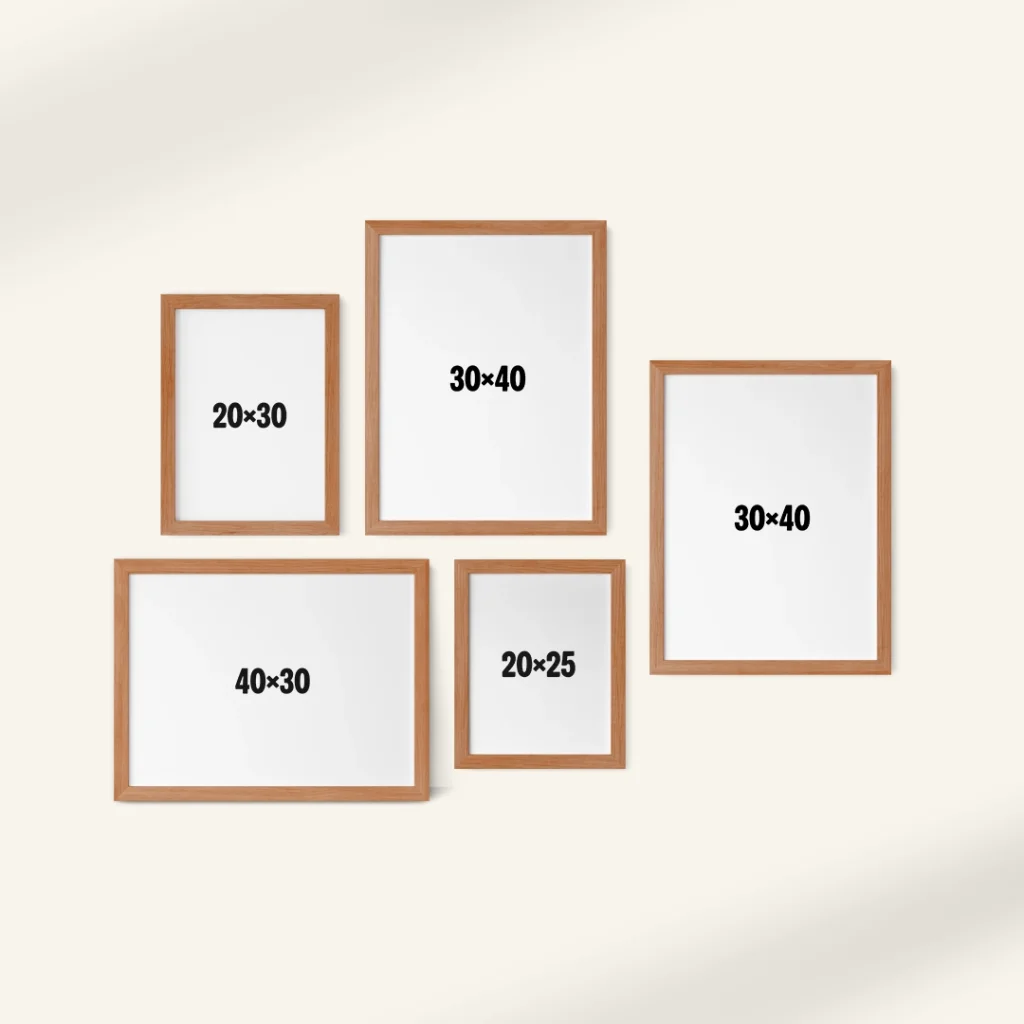 قابهای مقاوم و شیک (PVC با طرح چوب): هر تابلو دارای قابی از جنس PVC با روکش طرح چوب روشن است. این قابها با طراحی گرم و طبیعی خود، هماهنگی بینظیری با پالت رنگی شاداب تابلوها ایجاد میکنند و جلوهای روستیک-مدرن و بسیار دلنشین به مجموعه میبخشند.شامل تابلوهایی با ابعاد مختلف است که به شما امکان میدهد چیدمانهای خلاقانه و شخصیسازی شدهای را بر روی دیوار خود ایجاد کنید: