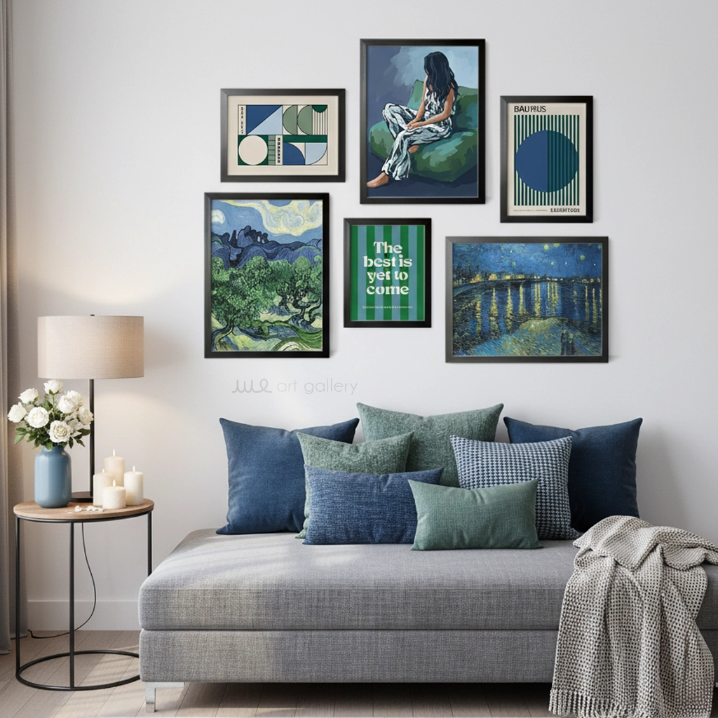 پالت رنگی عمیق و هنری: رنگهای غالب در این مجموعه شامل آبی تیره، سبز تیره، مشکی، کرم و زرد (در طرحهای ونگوگ) است. این پالت رنگی عمیق، هنری و در عین حال آرامشبخش، حسی از تفکر، عمق، طبیعت و هنر مدرن را به فضا میبخشد و به راحتی با دکوراسیونهای مدرن، کلاسیک، مینیمال و فضاهایی با تم هنری و متفکرانه هماهنگ میشود.