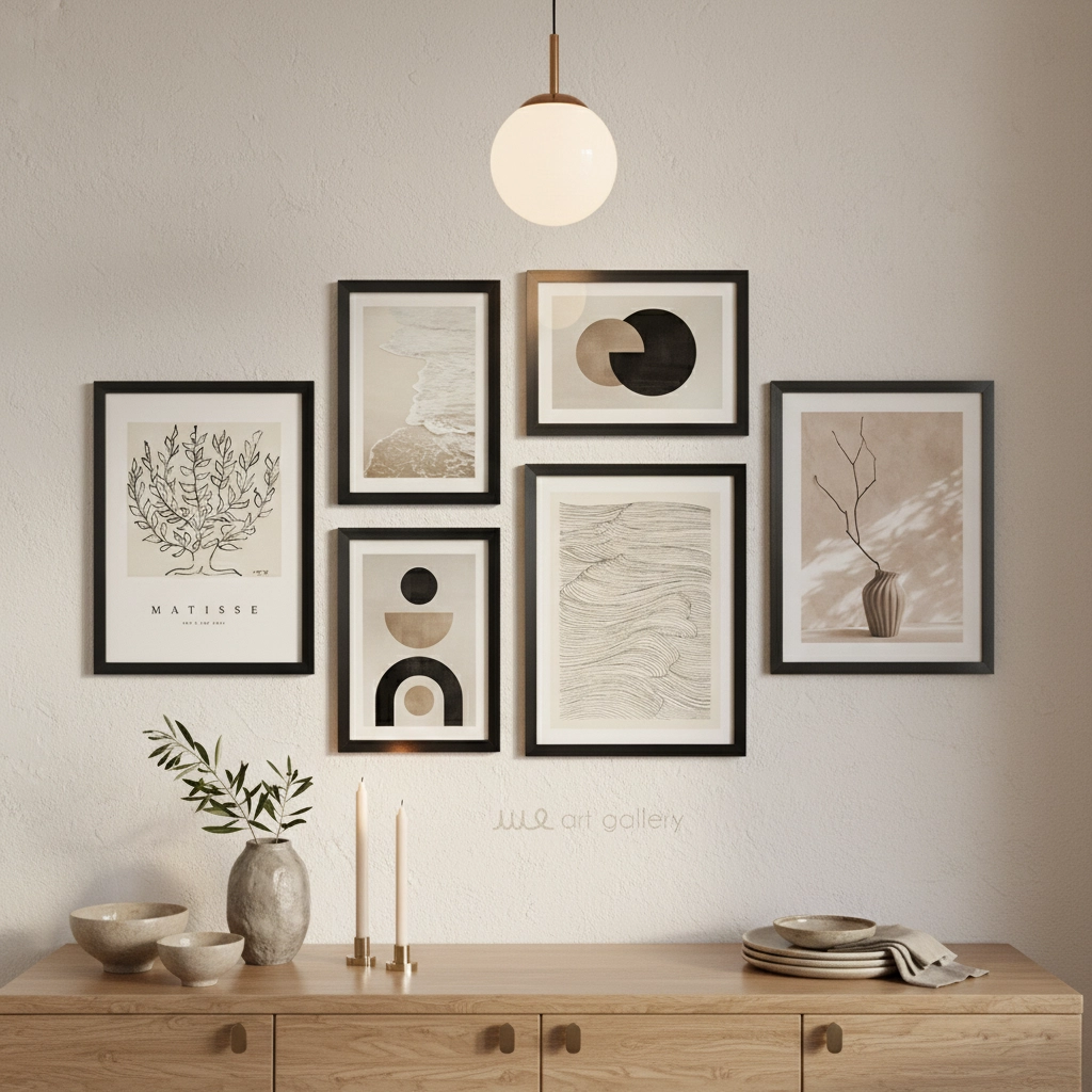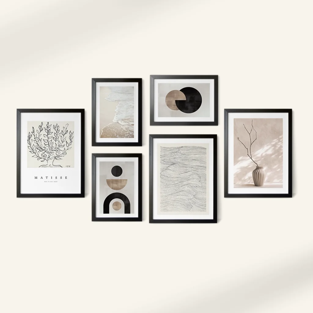 قابهای مقاوم و شیک (PVC مشکی): هر تابلو دارای قابی از جنس PVC به رنگ مشکی است. این قابها با طراحی تمیز و مدرن خود، کنتراست زیبایی با پالت رنگی خنثی تابلوها ایجاد میکنند و جلوهای شیک و معاصر به مجموعه میبخشند.