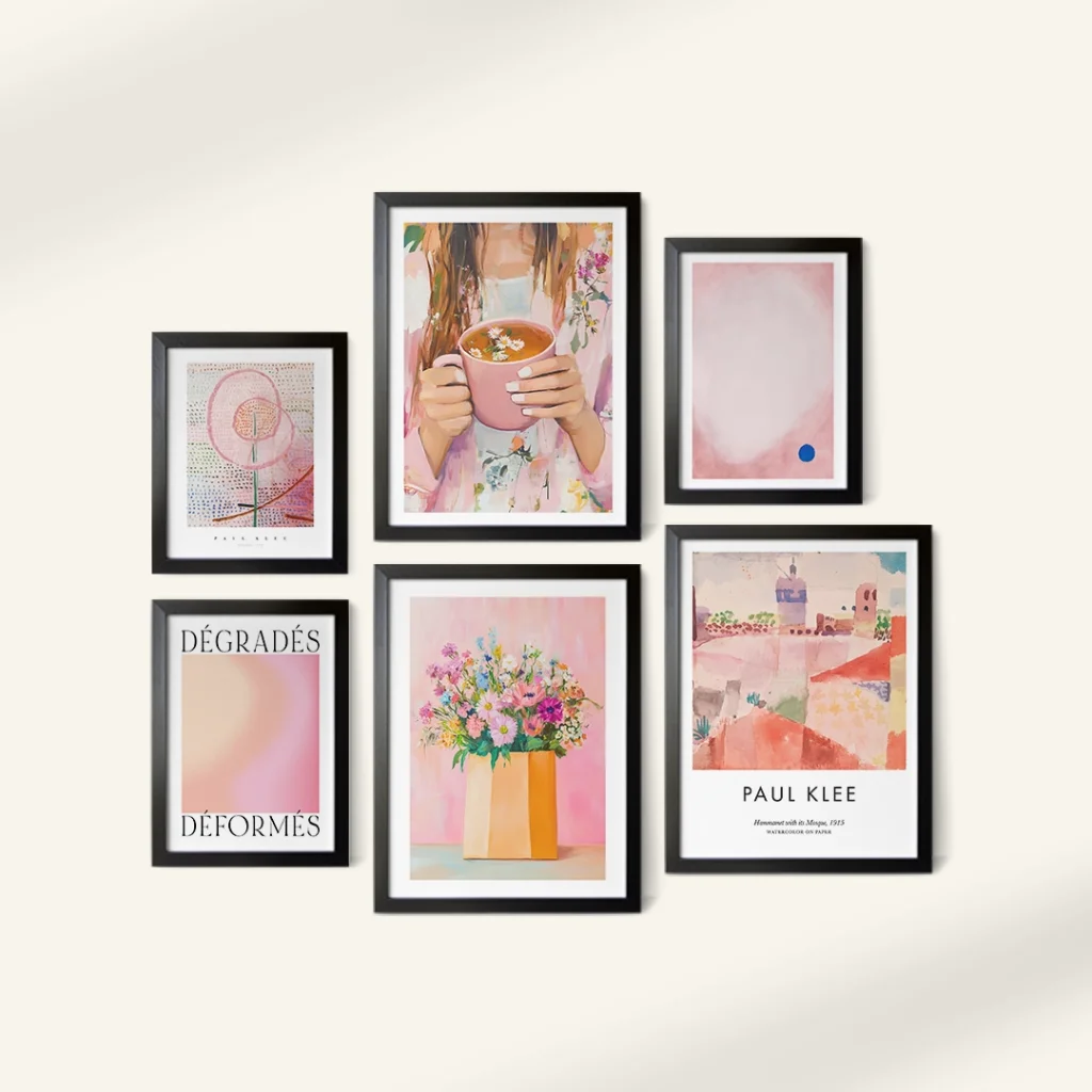 پالت رنگی غالب شامل طیفهای صورتی، گلبهی، کرم، سبز ملایم و جزئیات گرم است که در کنار قابهای مشکی، کنتراستی شیک و حرفهای ایجاد میکند. این ست انتخابی ایدهآل برای فضاهای مدرن، هنری و مینیمال با روحیه لطیف و آرام است.